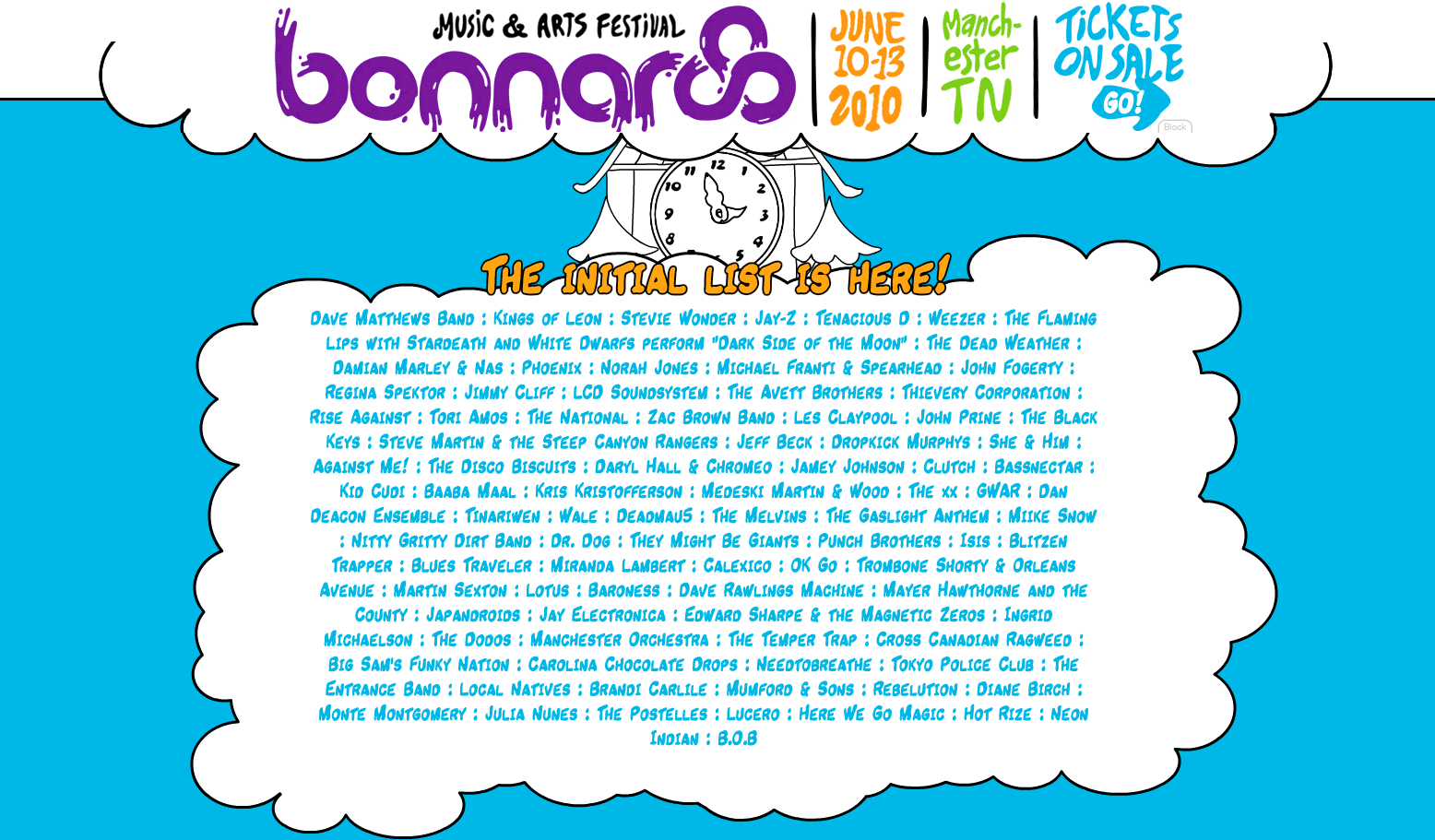 The Bonnaroo Music & Arts Festival announced its 2010 lineup today via a continually updated animation on the festival’s MySpace page. A new artist was announced every six minutes between 12 Noon and 9 PM… This novel, yet extremely drawn out announcement process was not well received by the online community.
